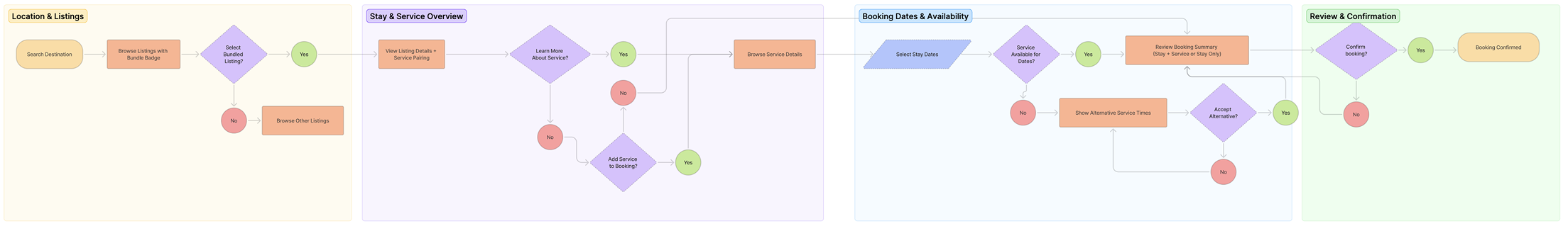 I mapped out the full user journey across four stages — discovery, filtering, evaluation, and booking — to see where the experience breaks down.