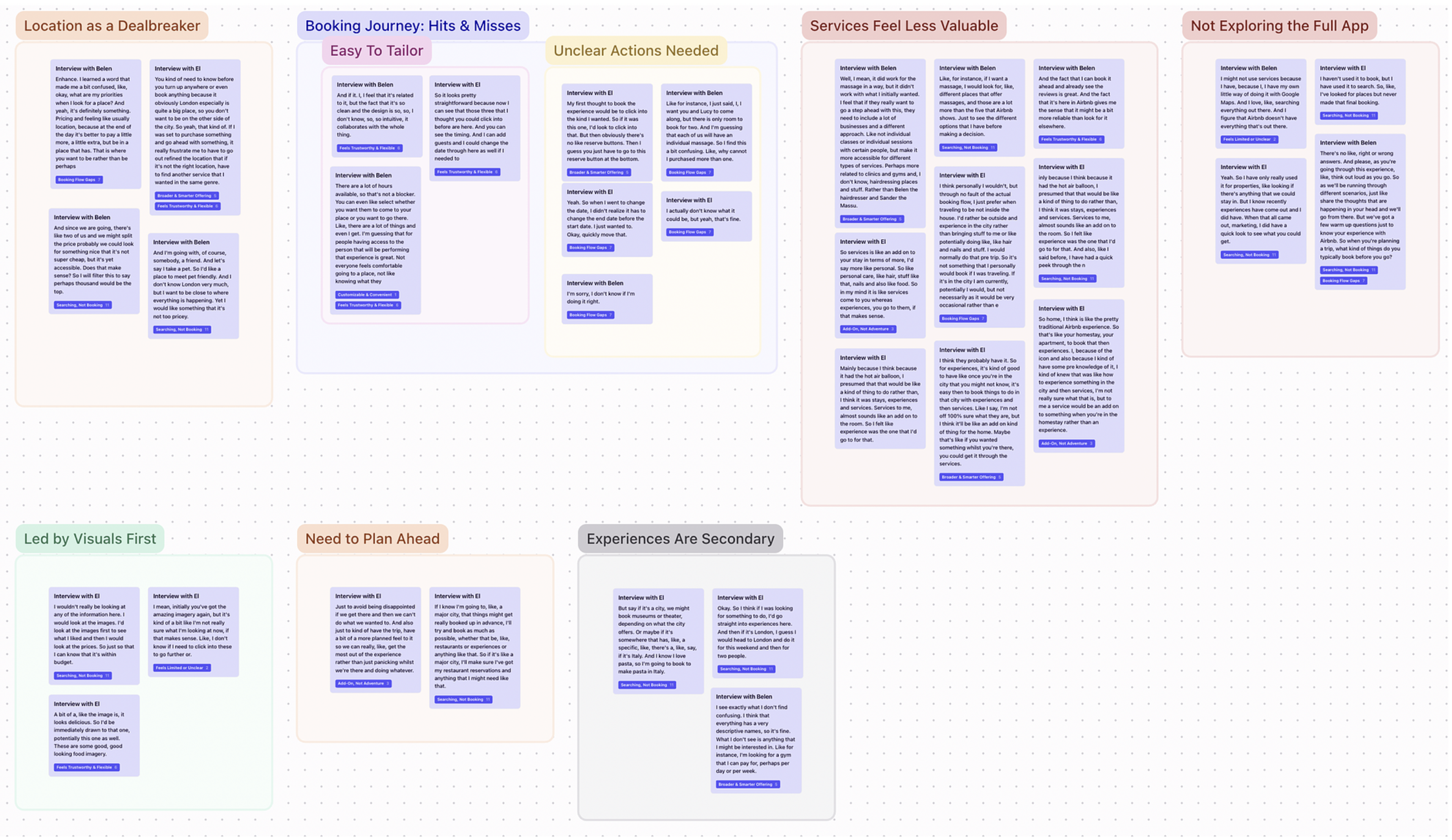 From the clusters and usability tests I was able to tag some outlying themes under which the users felt most taken aback throughout their booking journey. I then decided to move forward focusing my efforts on resolving tensions across these blocks.