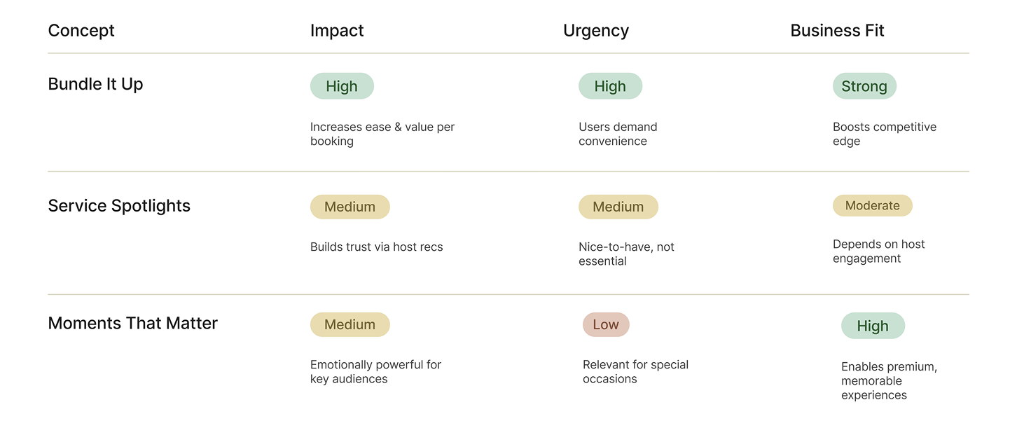After discovering 3 main concepts from FigJam I went back to ChatGPT to root out the best out of the three, prioritizing them based on impact, urgency and alignment of our goals.