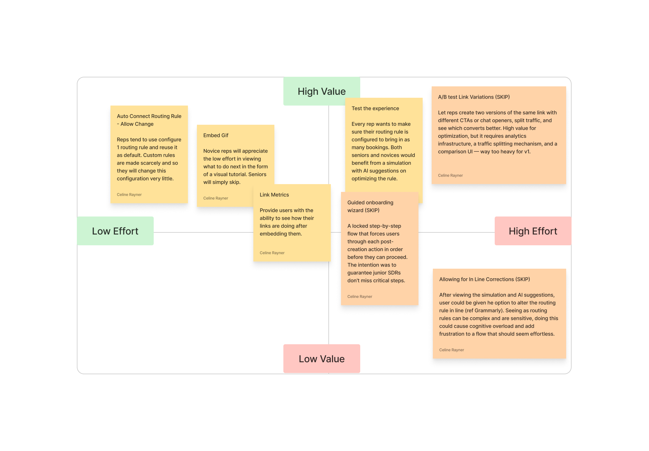 After gathering all the feedback from the usability sessions, I needed to decide which features to incorporate into the redesigned flow. I mapped every potential post-creation action onto a value vs. effort matrix, weighing both development and design effort against our time constraints. Four features landed in the high-value quadrant - everything else was deprioritized or saved for a future iteration.